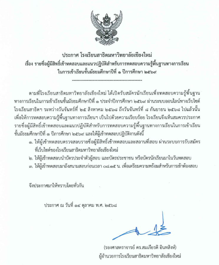 ประกาศ รายชื่อผู้มีสิทธิ์เข้าทดสอบและแนวปฏิบัติสำหรับการทดสอบความรู้พื้นฐานทางการเรียน ในการเข้าเรียนชั้นมัธยมศึกษาปีที่ ๑ โรงเรียนสาธิตมหาวิทยาลัยเชียงใหม่ ปีการศึกษา ๒๕๖๙