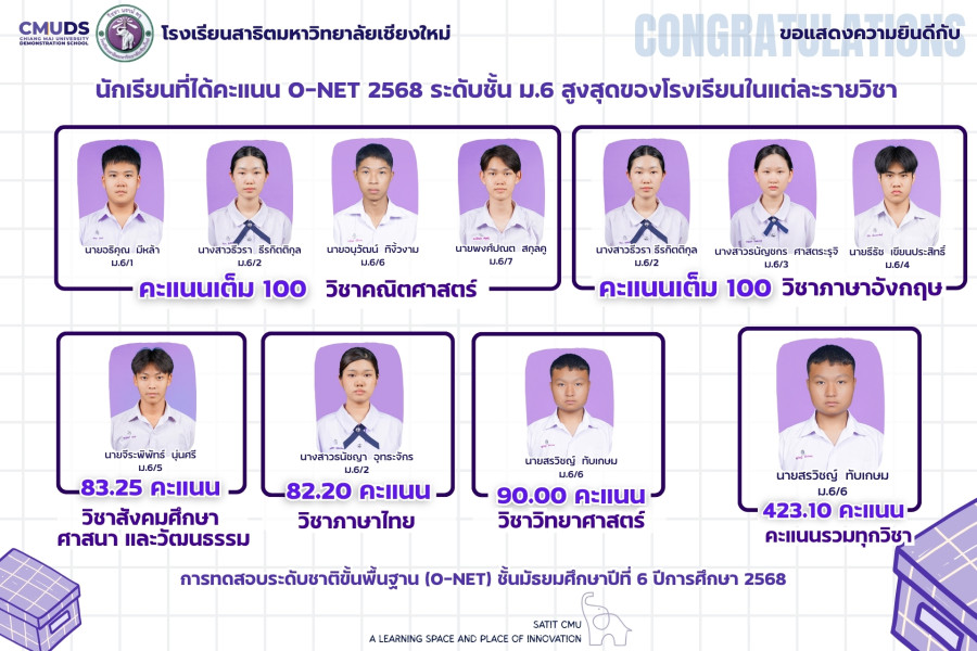 นักเรียนที่ได้คะแนนสูงสุดในแต่ละรายวิชา การทดสอบระดับชาติขั้นพื้นฐาน (O-NET) ชั้นมัธยมศึกษาปีที่ 6 ปีการศึกษา 2568 ของโรงเรียนสาธิตมหาวิทยาลัยเชียงใหม่